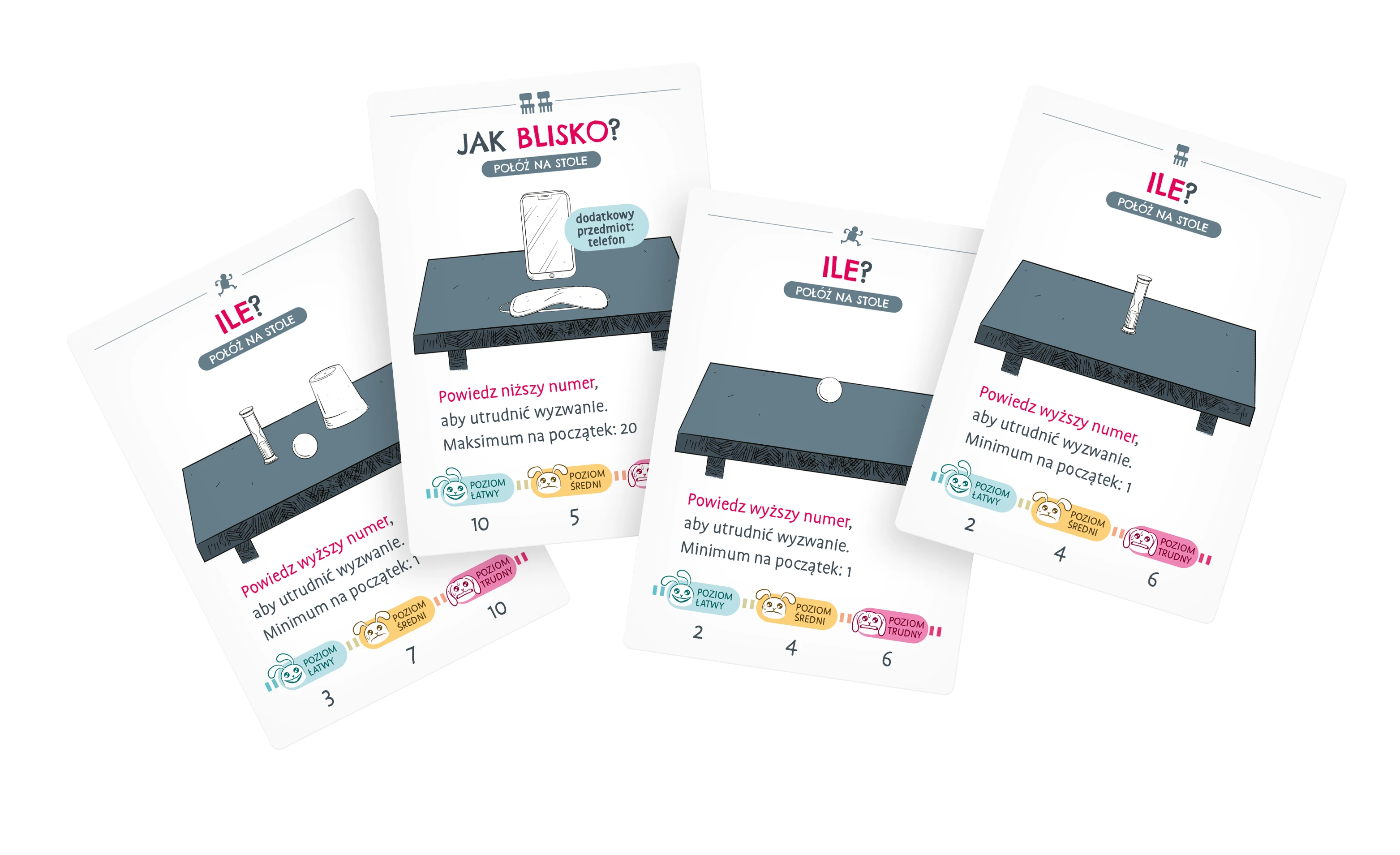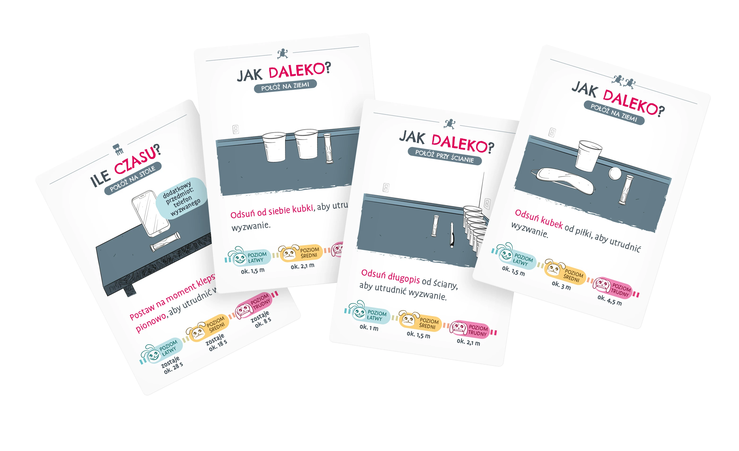 - Aby z sukcesem ukończyć wyzwania, użyjesz długopisów, kostek lodu, opaski na oczy, piłek, kubków, a czasem też swojego telefonu. Jeśli ta różnorodność Cię nie zaciekawiła, to naprawdę nie wiem, co jeszcze mogłoby to zrobić.