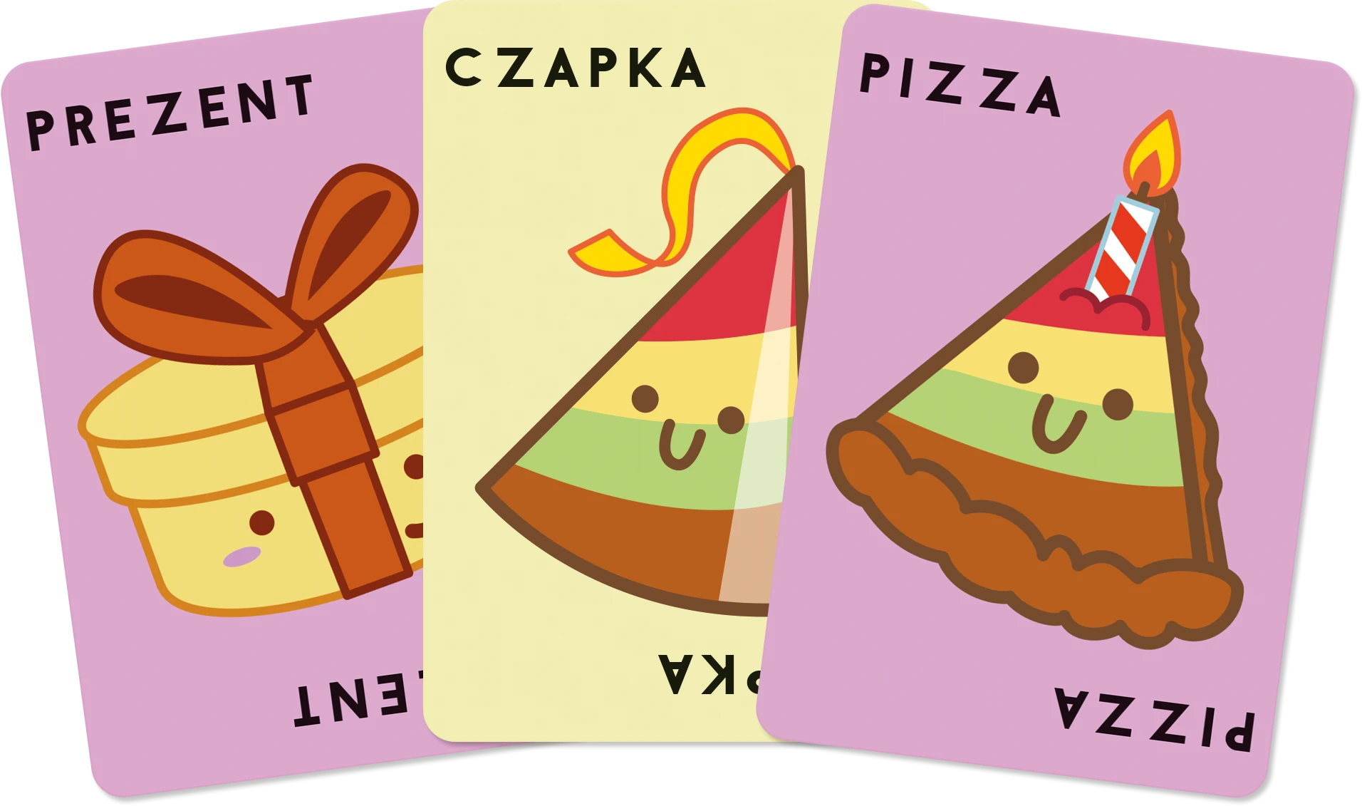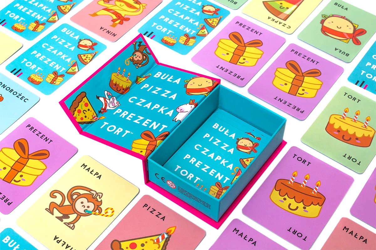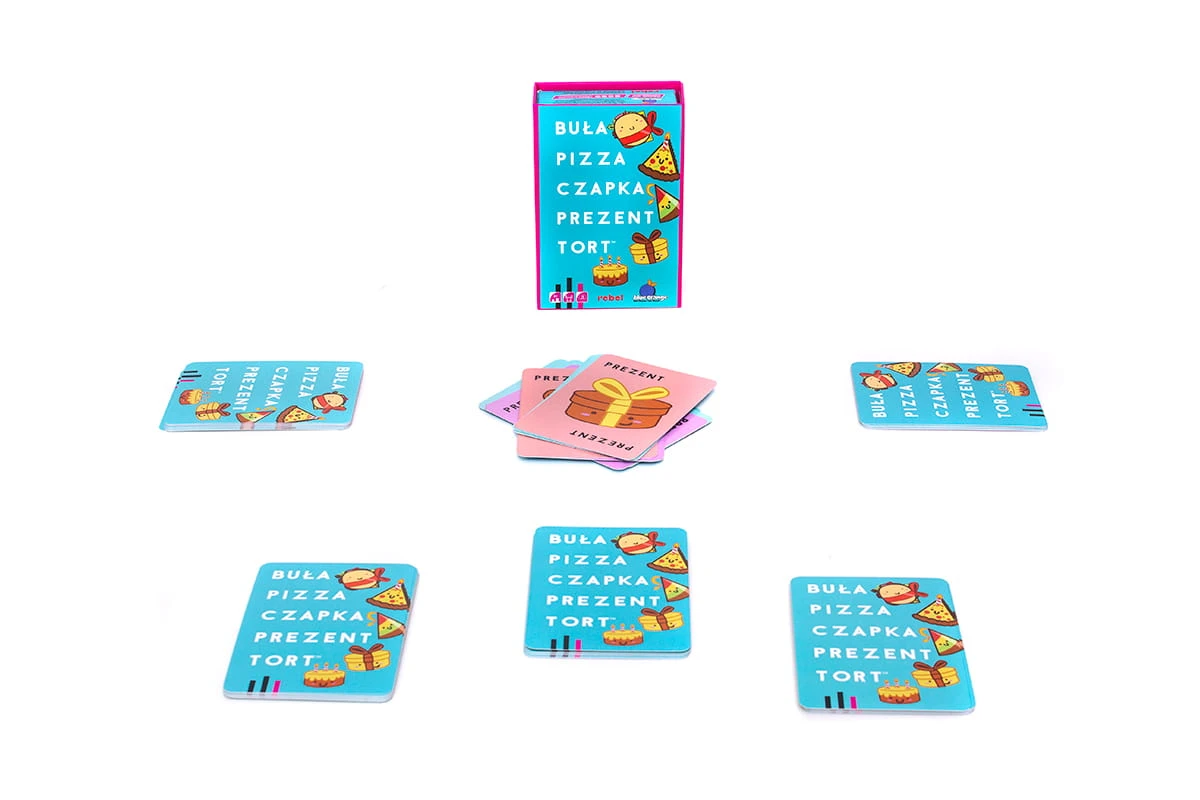Buła, Pizza, Czapka, Prezent, Tort! Wykładaj karty w rytm tej niecodziennej wyliczanki, a gdy wypowiedziane słowo pasuje do obrazka, klepnij kartę ręką, nakrywając ją. Ten, kto będzie ostatni, zabiera wszystkie karty, a zwycięży gracz, który pozbył się wszystkich!