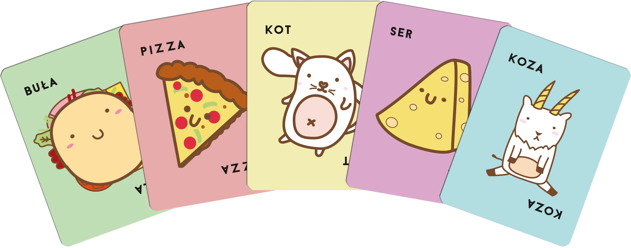 - Buła, Pizza, Kot, Ser, Koza to gra niesamowicie uniwersalna. Malutka, więc nadaje się do zabrania w absolutnie każdą podróż. Prosta, więc nie wymaga długiego tłumaczenia. A do tego trwa krótko, a do samej zabawy nie potrzebujemy wiele miejsca. Wystarczy kawałek płaskiej powierzchni, który możemy wspólnie otoczyć.