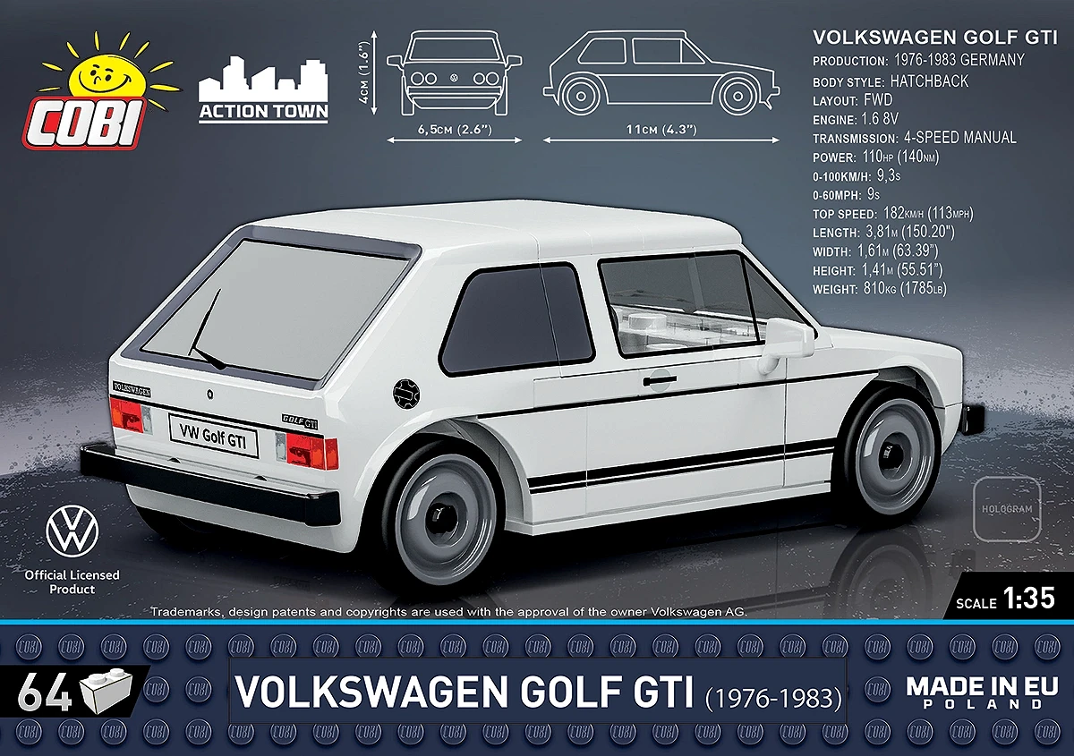 Cars Volkswagen Golf (1976-1983) - COBI to wyjątkowy model samochodu, który wciągnie dzieci w wieku 5–11 lat w świat motoryzacyjnych przygód i kreatywnej zabawy. Zestaw rozwija zdolności manualne, cierpliwość oraz wyobraźnię, pozwalając najmłodszym na samodzielne składanie elementów i odkrywanie detali klasycznego Volkswagena.