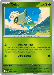Celebi to podstawowy Pokémon typu Grass z 80 HP. Ma atak Traverse Time, który pozwala przeszukać talię i dobrać do 3 kart w kombinacji Pokémonów typu Grass i/Stadium oraz atak Solar Cutter (30 obrażeń) – solidny ruch ofensywny w średniej fazie gry.