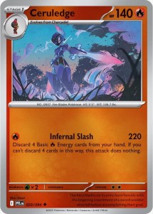 Stage 1 typu Fire, ewoluujący z Charcadet. Ceruledge wyróżnia się ogniową mocą i efektownymi atakami. Reverse Holo podkreśla jego mroczny, płomienny charakter i świetnie prezentuje się w kolekcji fanów Pokémonów typu Fire.