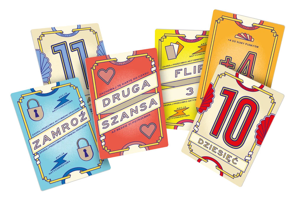 Dobierz kartę z numerem, aby zdobyć odpowiadającą mu liczbę punktów. Teraz kolejna! A może jeszcze jedna? Im więcej kart dobierzesz, tym więcej punktów wpadnie na Twoje konto. Ale uważaj! Jeśli któryś numer się powtórzy, odpadniesz i stracisz wszystko, co udało Ci się zebrać w tej rundzie!