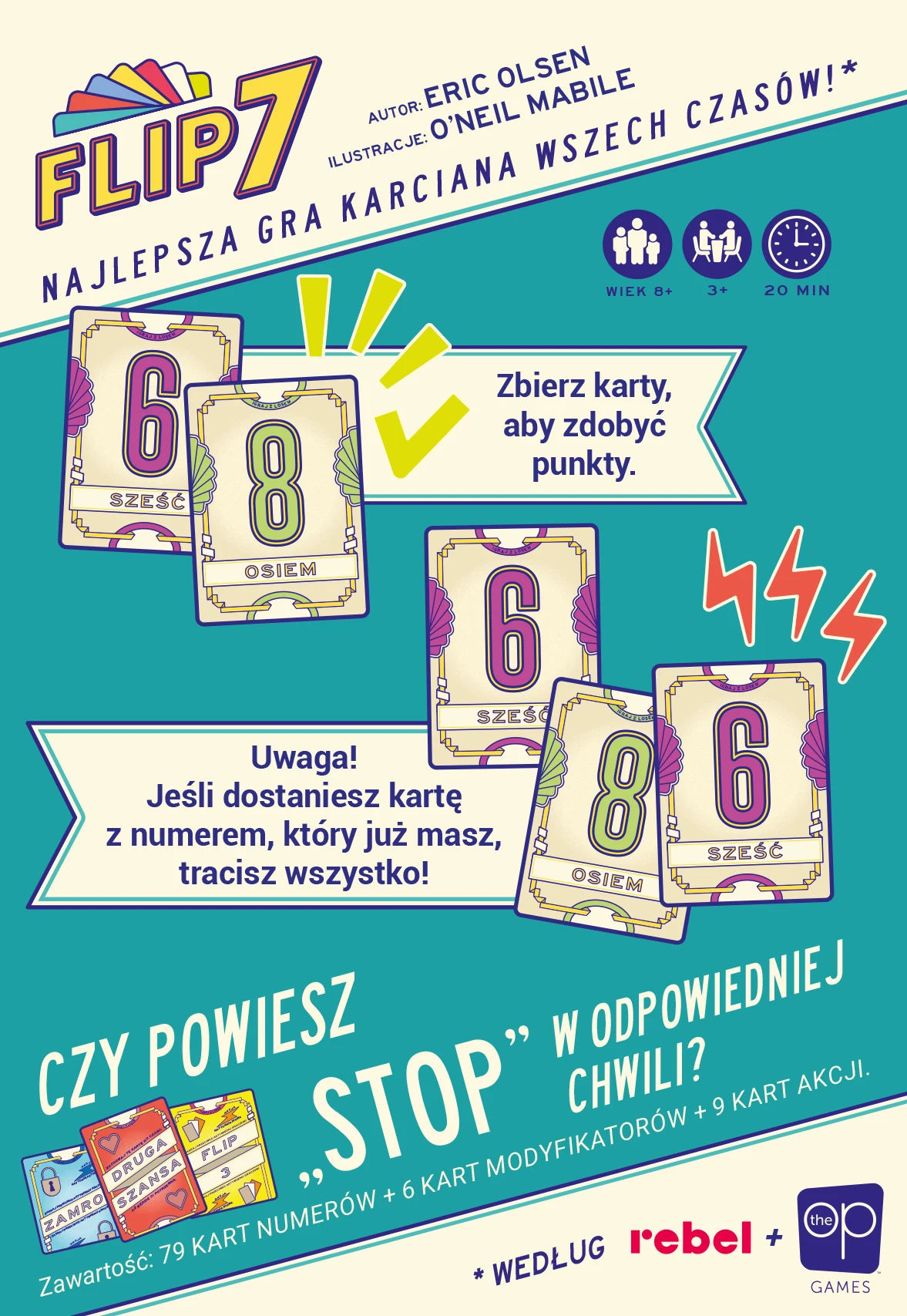 Flip 7 to niezwykle prosta gra karciana oparta na kuszeniu losu. W każdej turze decydujemy, czy podejmujemy ryzyko, próbując powiększyć nasz dorobek punktowy, czy też wolimy spasować i zachować to, co już udało nam się zebrać. Zwycięzcę wyłonimy, gdy ktoś przekroczy 200 punktów, więc czeka nas emocjonujący wyścig pełen niespodziewanych zwrotów akcji!