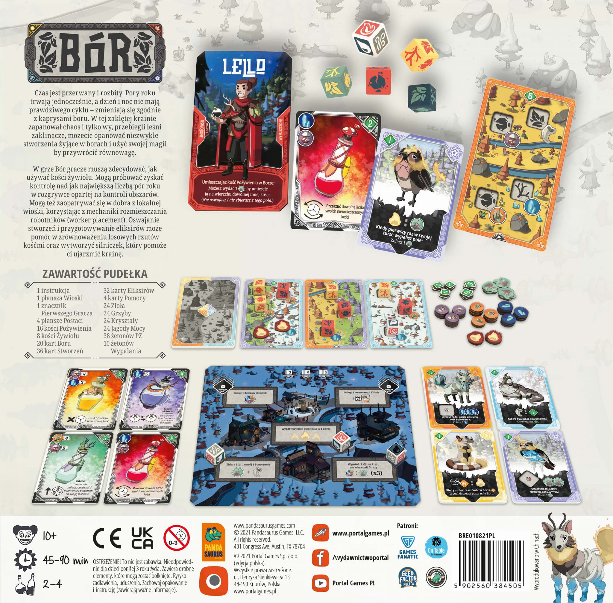 Bór to strategiczna gra planszowa prosto od wydawnictwa Pandasaurus Games (Wyspa dinozaurów, Dinosaur World). Wcielimy się tutaj w zaklinaczy leśnych stworzeń, przyrządzających magiczne mikstury w tajemniczym lesie, w którym pory roku się ze sobą wymieszały. Bór łączy proste zasady oparte na rzutach kośćmi ze sporym ładunkiem strategicznym area controle i worker placement. W czasie rozgrywki możemy obrać kilka strategii, skupiając się na jak największej kontroli obszarów albo też umiejętnie rozporządzać swoimi robotnikami. Oswajając kolejne Stworzenia i przygotowując Mikstury, będziemy równoważyć losowe wyniki rzutów i stopniowo budować nasz silniczek akcji. Gra posiada niesamowitą szatę graficzną, przywodzącą na myśl kreskę japońskiej animacji i pięknie wykonane komponenty z customowymi kośćmi na czele.