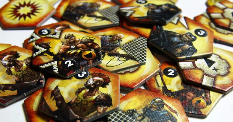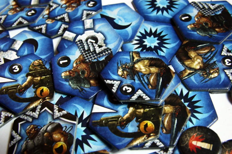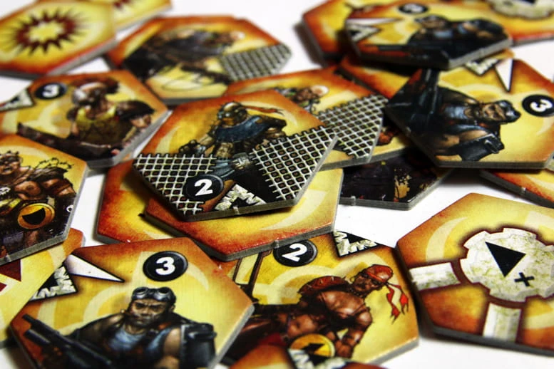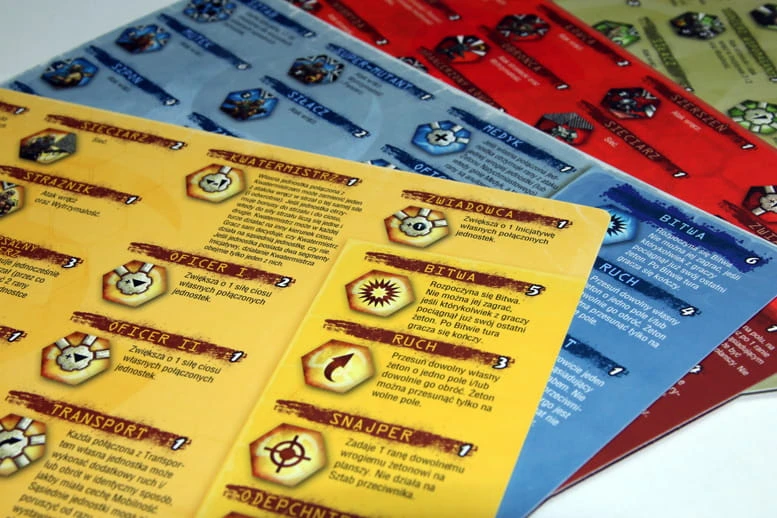 Każda armia składa się z 35 żetonów, na które składają się żetony jednostek oraz akcji specjalnych. Jednostki wykłada się na planszę, na dowolnym polu nie zajętym przez inny żeton. Każda z nich ma oznaczenie informujące, czy jest jednostką strzelającą czy walczącą wręcz a także inicjatywę (o wartości od 0 do 3). Na żetonie znajdują się także symbole oznaczające z jaką siłą i w jakie kierunki atakuje. Niektóre jednostki mają zdolności specjalne, np. „Sieciarz” może zablokować działanie sąsiadującej jednostki, inne mogą atakować dwukrotnie, jeszcze inne mają zamontowany pancerz itp. Symboli jest niewiele, są czytelne i bardzo łatwo się w nich połapać - nie trzeba ich nawet specjalnie znać przed rozgrywką. Przykładowe żetony można zobaczyć w galerii poniżej.