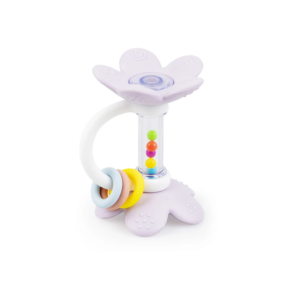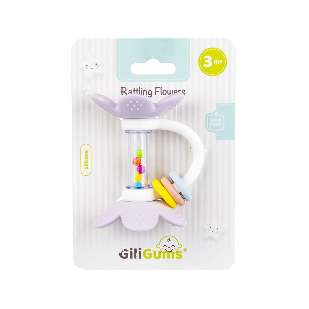 Grzechocząca zabawka w pastelowych odcieniach to przepis na odprężającą rozrywkę i ukojenie obolałych dziąseł! Urocze kwiatki z wypustkami na płatkach sprawdzą się świetnie w roli gryzaka, przynosząc ulgę ząbkującym maluchom. Pomiędzy kwiatkami znajduje się pionowa tuba wypełniona koralikami, które, przy potrząsaniu zabawką, wesoło grzechoczą. Praktyczny uchwyt, ozdobiony trzema ruchomymi kółeczkami, ułatwi małym rączkom chwytanie zabawki.