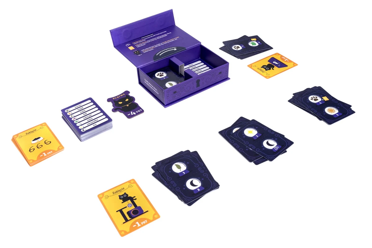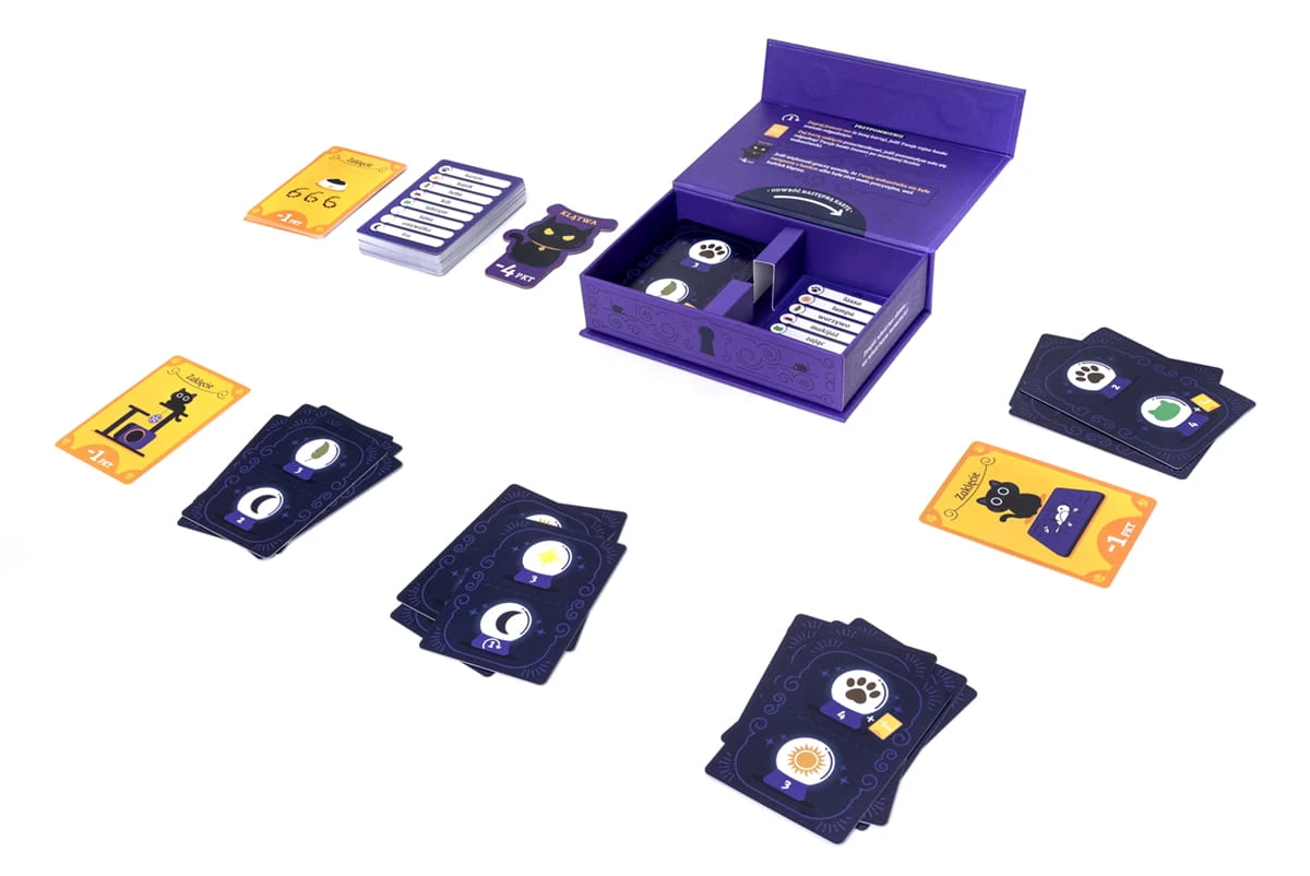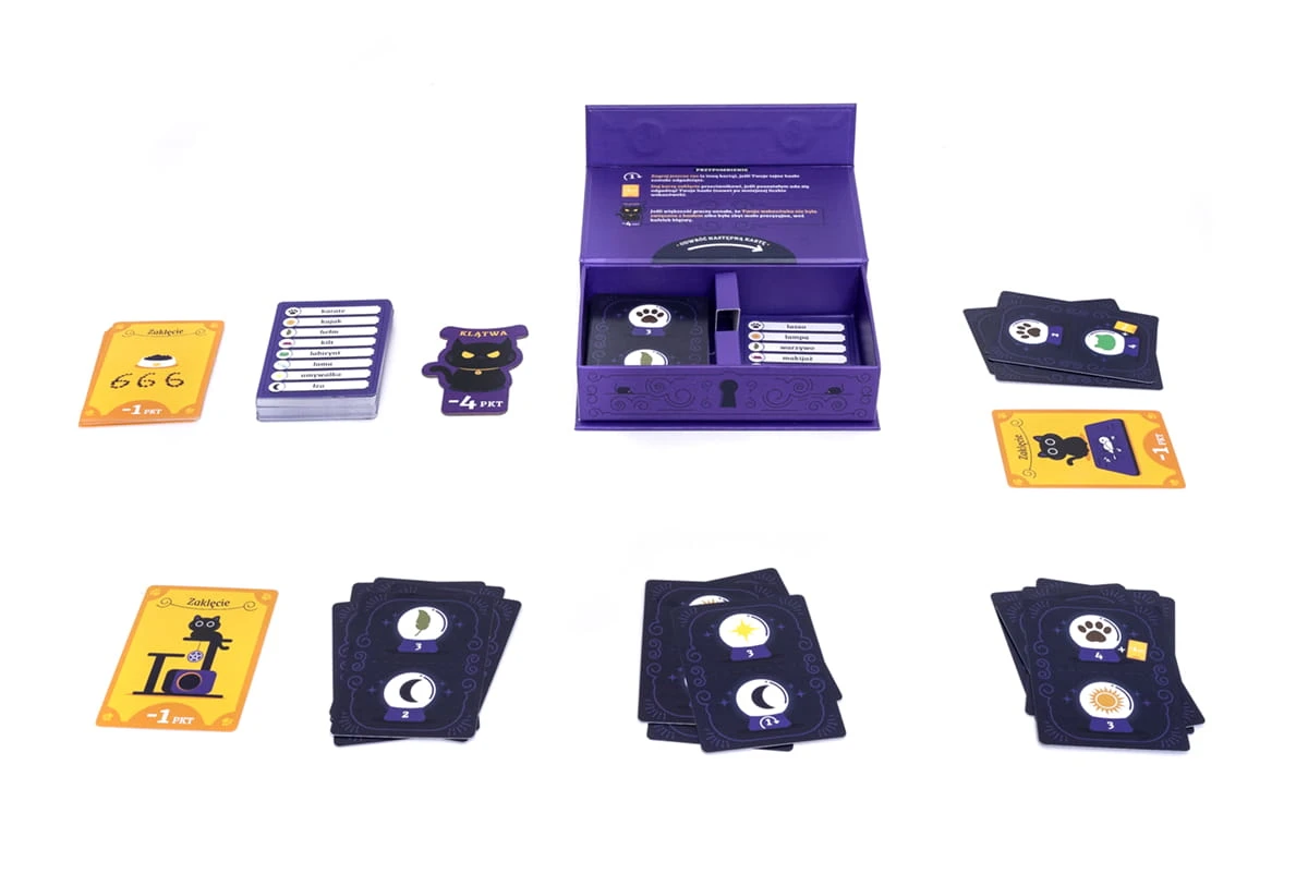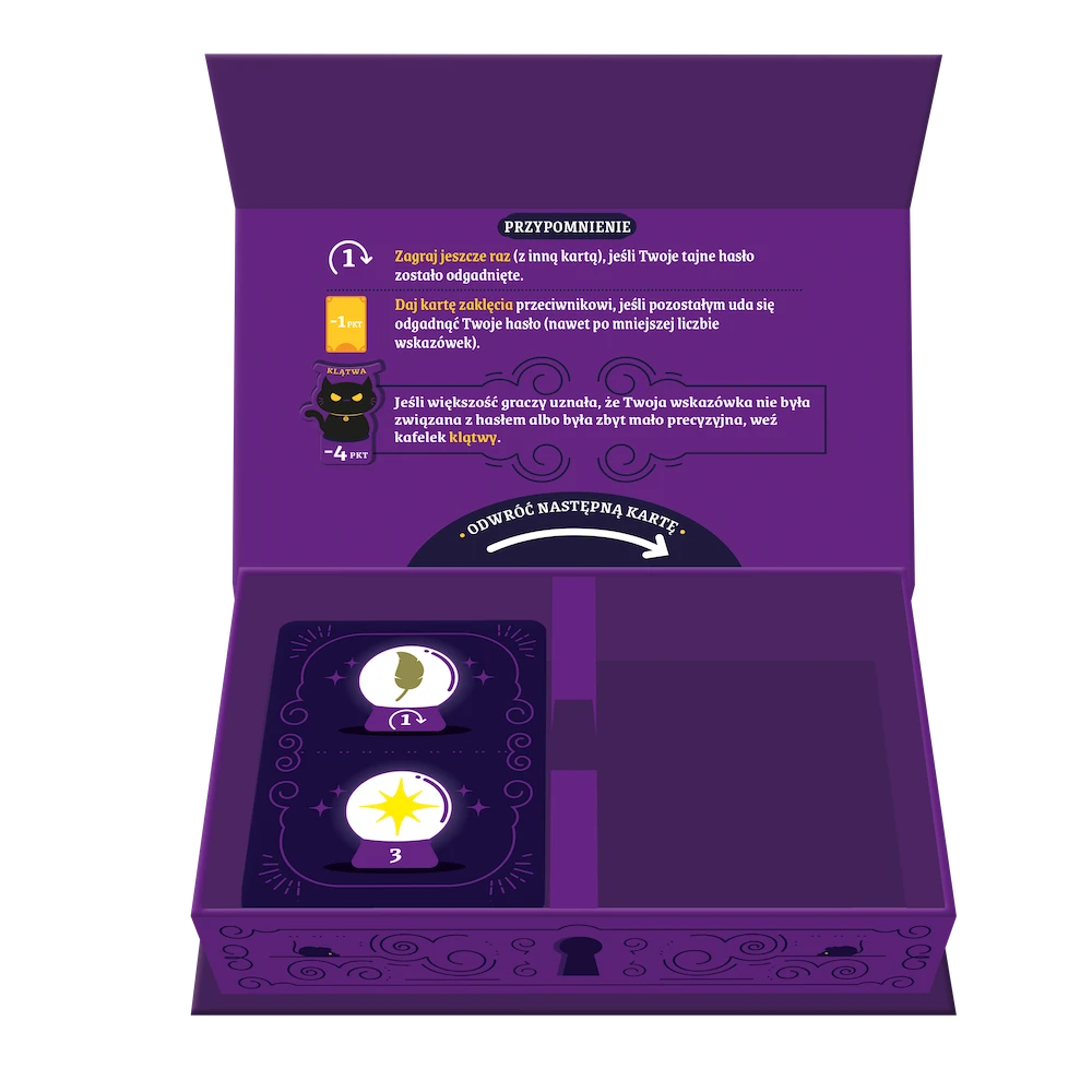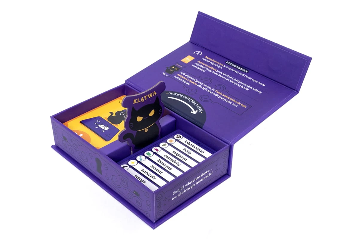 Otwórz pudełko i odkryj tajne hasło, a następnie pomóż innym je odgadnąć na podstawie dokładnie tylu wskazówek, ile wskazuje karta. Jeśli przeciwnicy domyślą się zbyt szybko, zgarną Ci punkty sprzed nosa, ale uważaj – starannie dobieraj słowa, bo jeśli Twoje podpowiedzi zostaną uznane za nieprecyzyjne, możesz paść ofiarą Kociej klątwy!