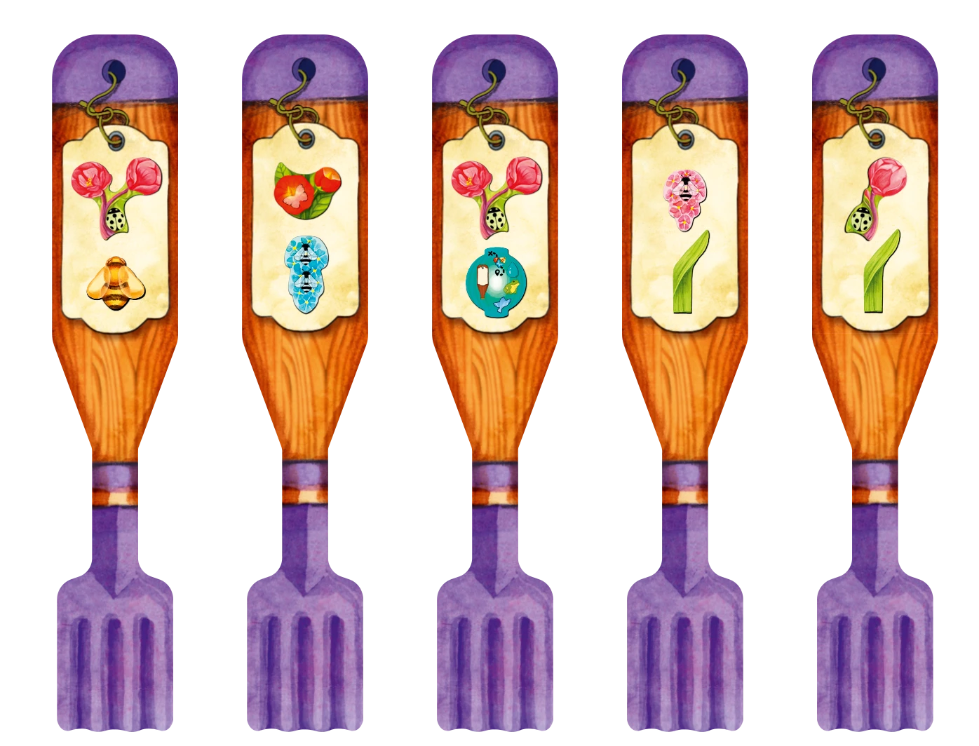- Na początku swojej tury wybieramy 1 z 4 dostępnych narzędzi. Znajdziemy na nim elementy, które dobieramy ze wspólnych zasobów, głównie różne rodzaje roślin. Oprócz tego pod narzędziami znajduje się specjalna planszetka z akcjami – w dalszej części tury możemy wykonać akcję przypisaną do narzędzia, które wybraliśmy.