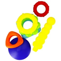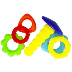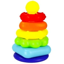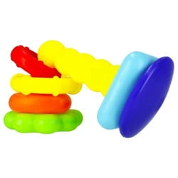 Układanie kaskadowe okręgów, a następnie potrząsanie nimi dostarcza dziecku wielu radości i aktywizuje go do działania.