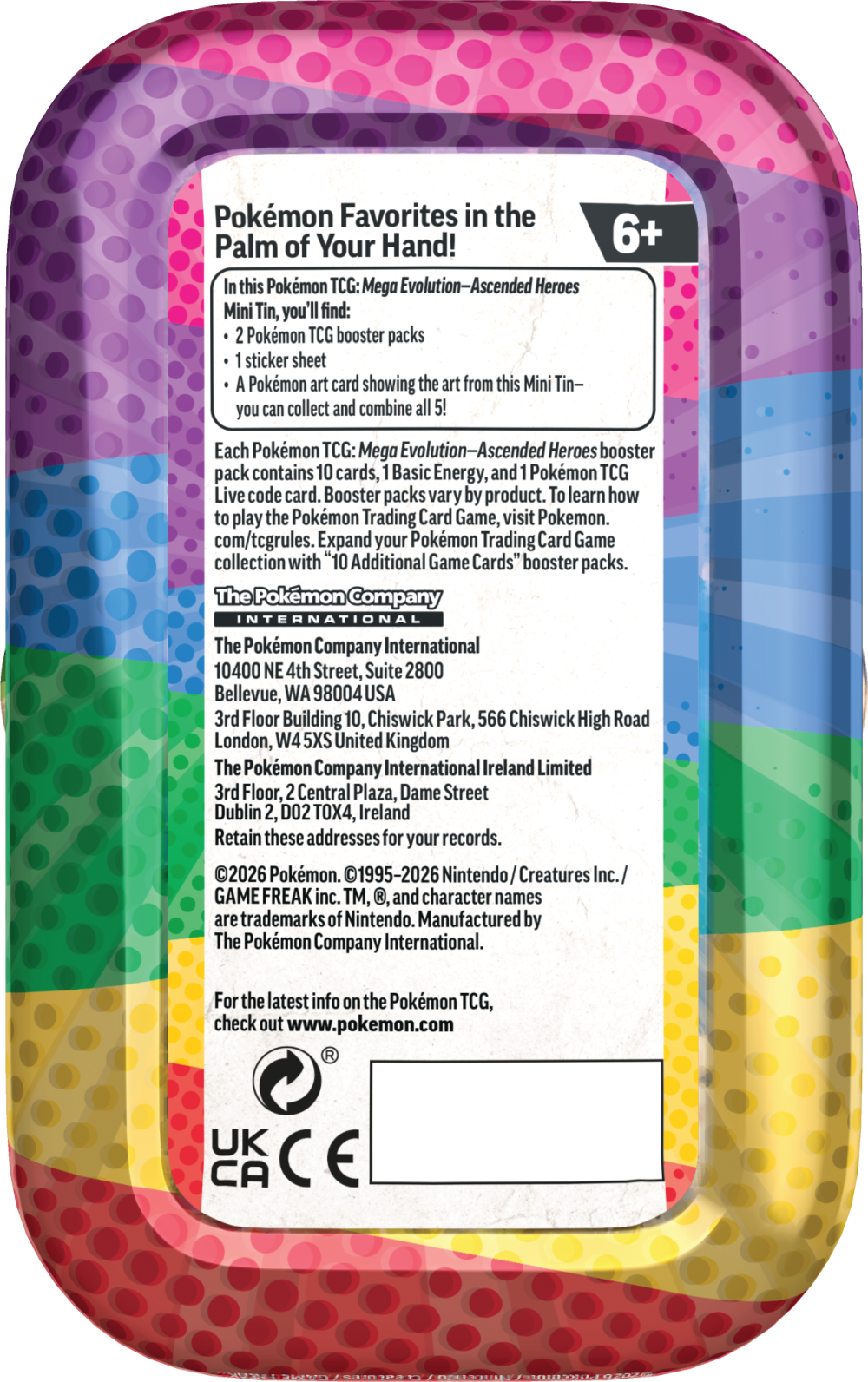 Każda puszka Pokémon TCG: Mega Evolution - Ascended Heroes - Mini Tin składa się z 2 boosterów, 1 arkusza naklejek i kartę z ilustracją z puszki.