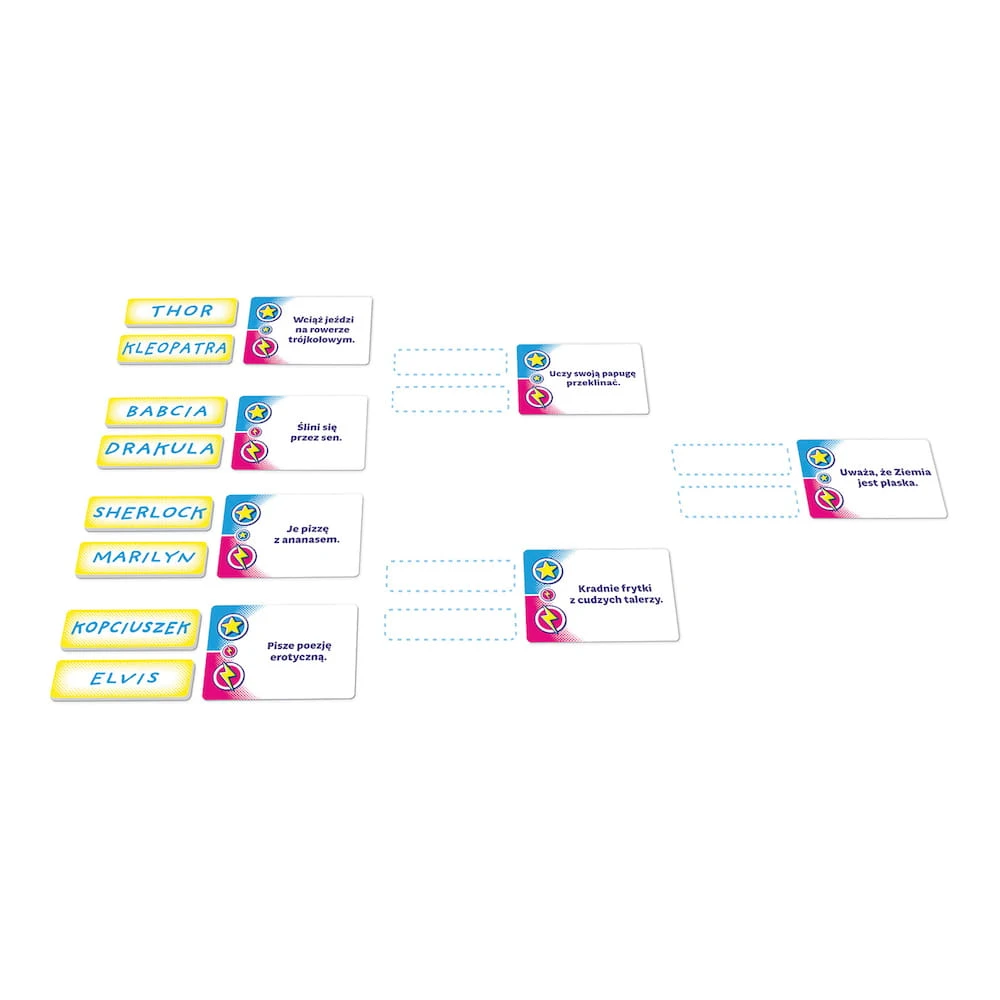 Rundę rozpoczynamy od przygotowania drabinki turniejowej. Gracze wpisują imiona zawodników (to mogą być fikcyjne postacie, rzeczywiste gwiazdy, a nawet inne osoby siedzące przy stole) na specjalnych kafelkach, które następnie mieszamy. Losujemy i wykładamy 7 kart pojedynków, a następnie dodajemy do nich zawodników.