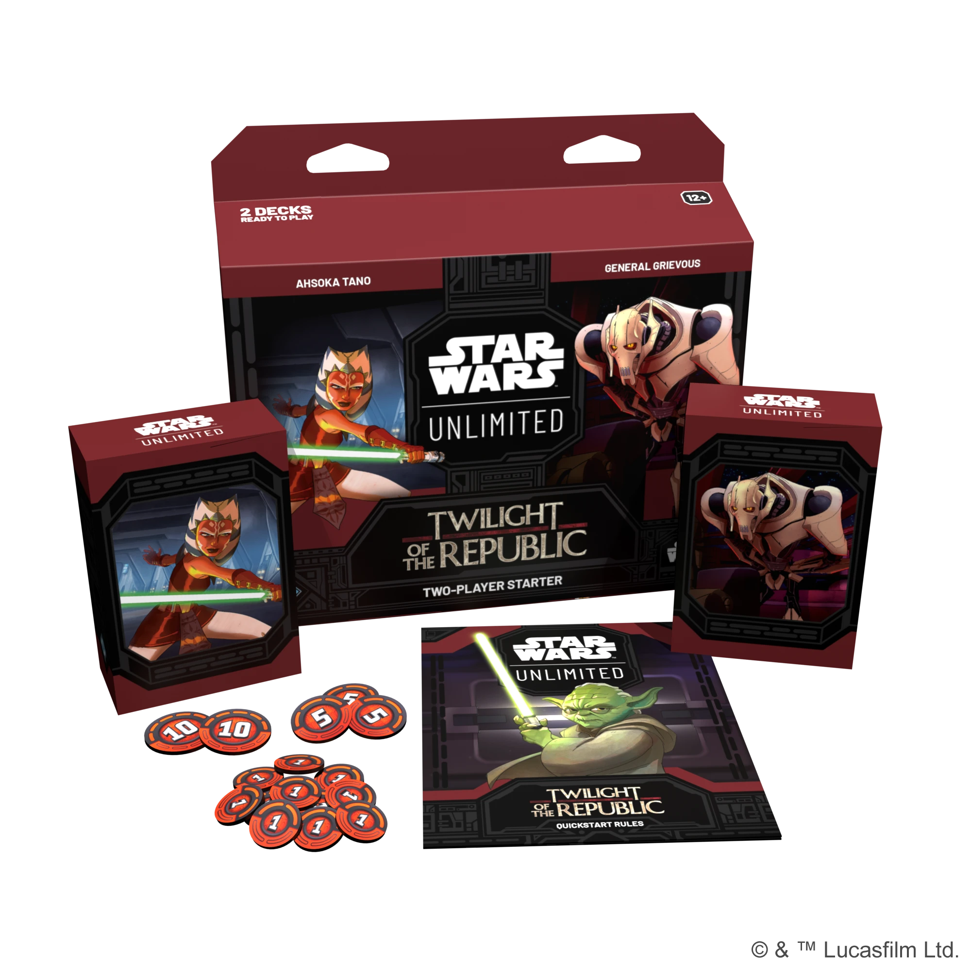 Star Wars: Unlimited - Twilight of the Republic - Two-Player Starter to dwie gotowe do gry talie, szybkie wprowadzenie w zasady i masa akcesoriów.