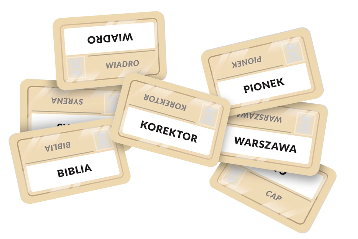 - W grze używamy specjalnych, dwustronnych kart kluczy. Wskazują one, na które hasła musimy naprowadzić drugą osobę, a których powinniśmy unikać.